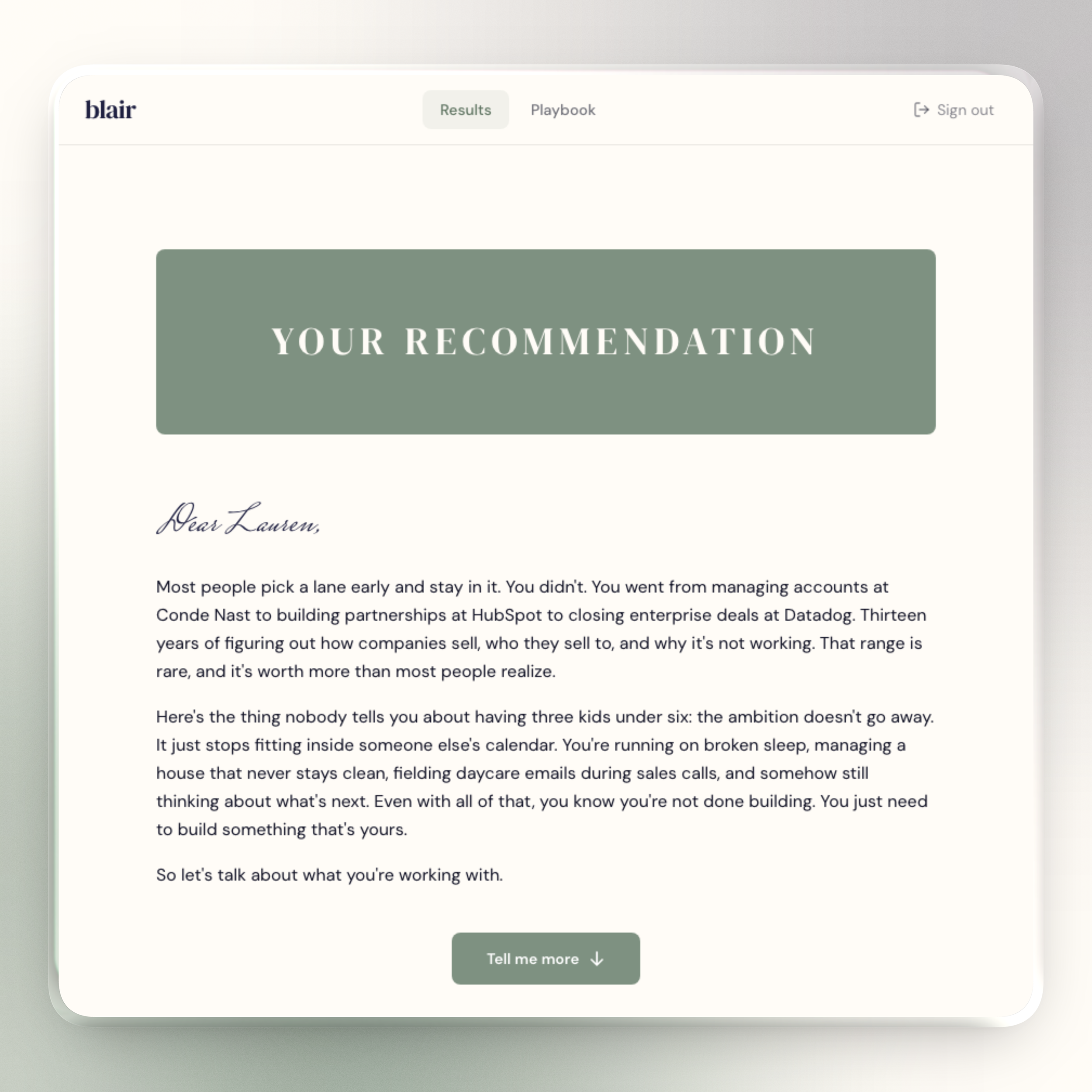 I talked to women who had actually done it, not in theory but in practice. Consultants who went from zero to consistent income. Fractional execs who replaced their corporate salaries. Founders who built six-figure businesses while working full-time with young kids. I asked what worked, what didn't, and what they'd do differently starting over today. Then I turned those patterns into the recommendation engine and playbooks that live inside Blair.